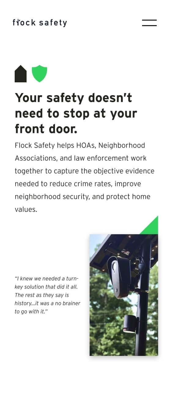 "ANML thrives at turning the vision of your website into reality. They were strong partners from creative ideation to execution. Once the site launched their team continued to be a valued partner of Flock Safety, doubling our conversion rate within five months post-launch."