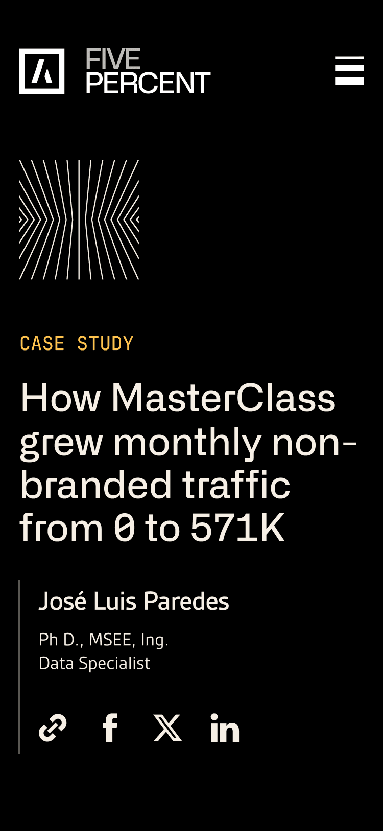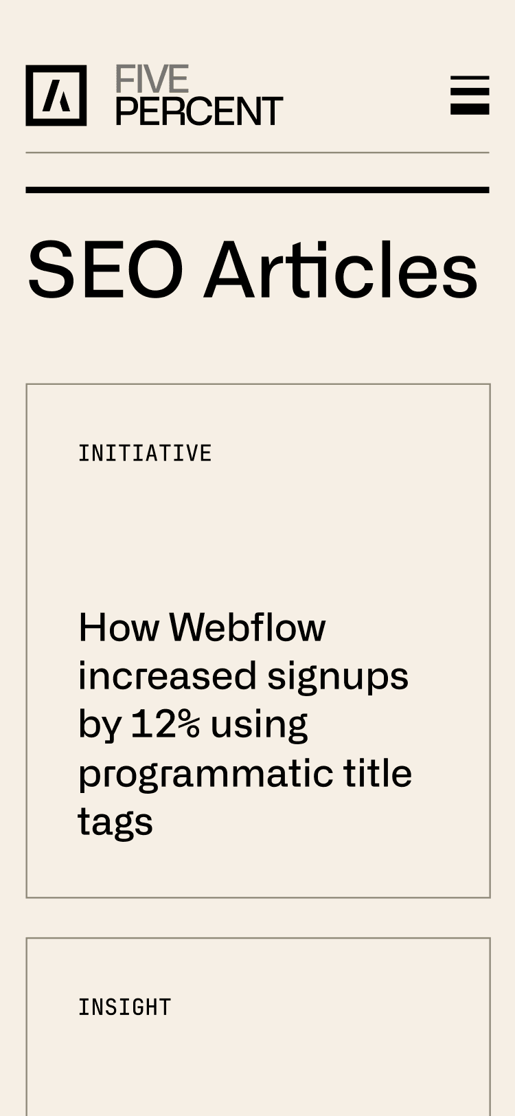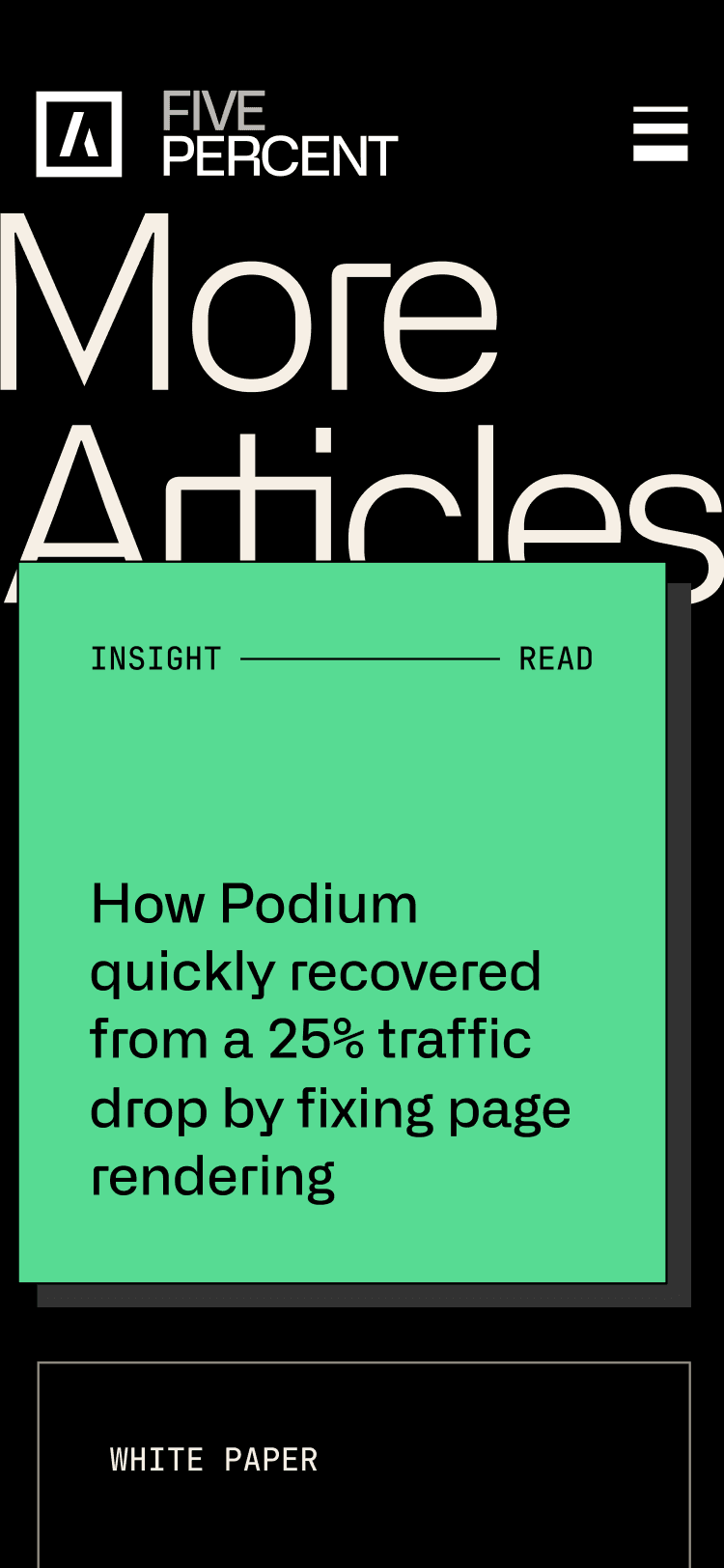 When Graphite, a growth agency specializing in SEO and content strategy, set out to create a hub for high-impact search strategies, they turned to ANML for design expertise. The result was The 5%, a content hub built to house Graphite’s most valuable insights. The name reflects a crucial SEO truth: while 95% of SEO work yields minimal impact, it’s the remaining 5% that drives real results. ANML crafted an engaging, intuitive platform that not only showcases Graphite’s thought leadership but also empowers readers to focus on the strategies that truly move the needle.